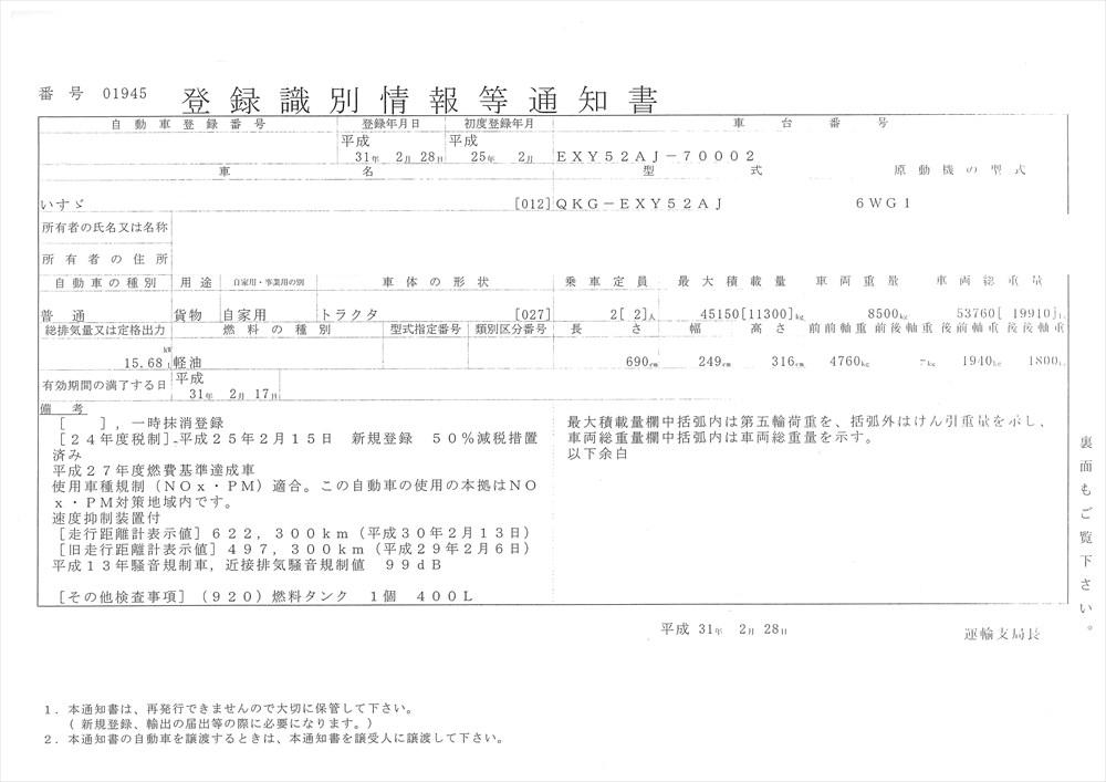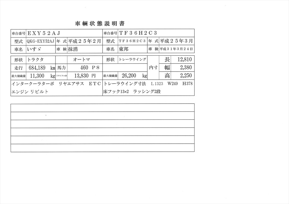 | コメント | AC PS PW ABS エアバック インタークーラターボ リヤエアサス ETC トレーラウイング寸法 Ⅼ12810 W2380 H2250 床フック13×2 ラッシング2段 保障なし 価格のお問い合わせは、090-3156-0406(名輸自動車・ナカヤ)まで。 |