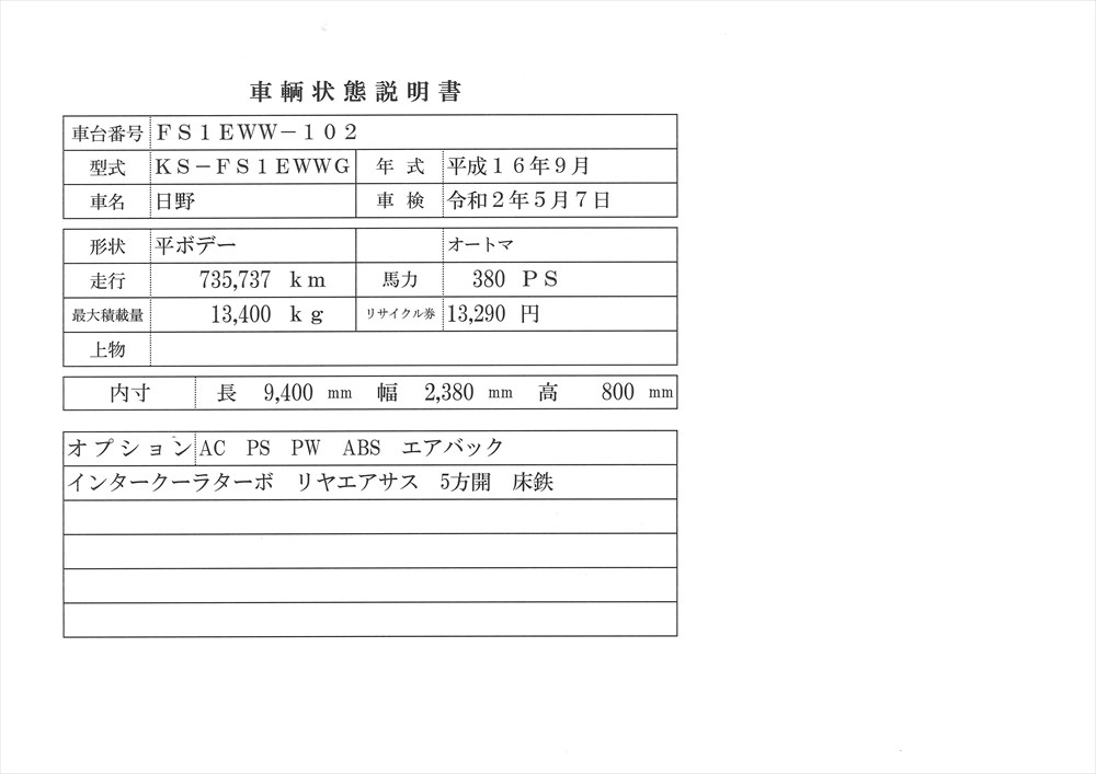 | 荷台内寸 | 9400×2380×800cm 長x幅x高 |