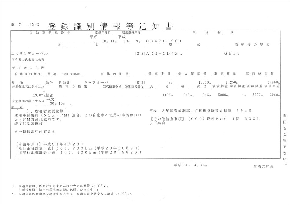 | 荷台内寸 | 950×236×50cm 長x幅x高 |