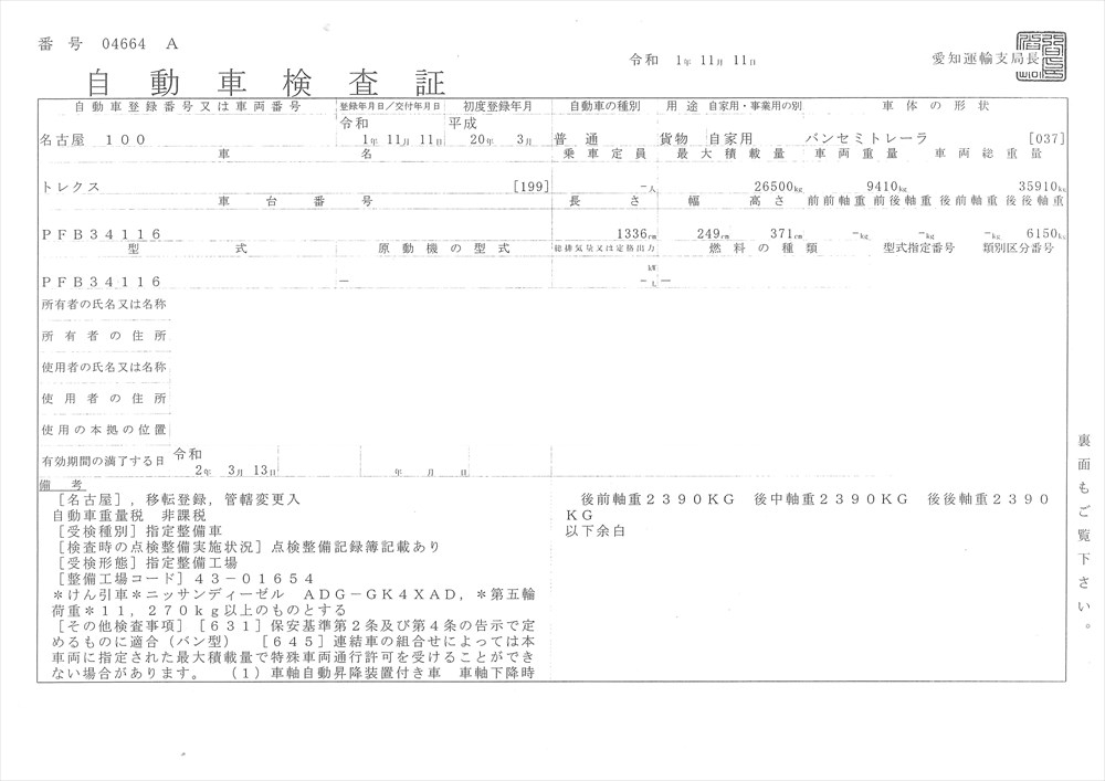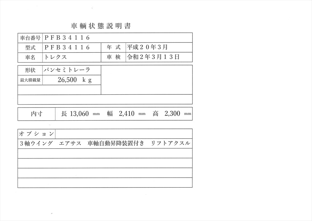 | コメント | リフトアクスル 3軸ウイング エアサス 車軸自動昇降装置付き ボデー内寸13m6cm 積載26.5t 車検令和2年3月 エアサス セット販売もします。 価格のお問い合わせは、052-821-1557(ナカヤ)まで。 保障なし |