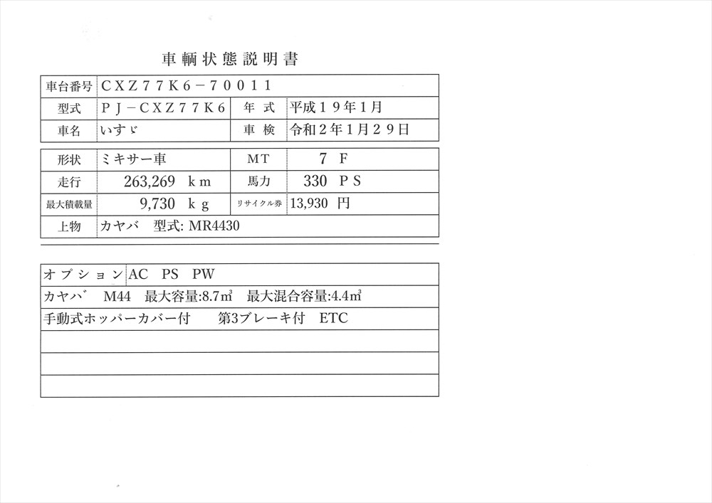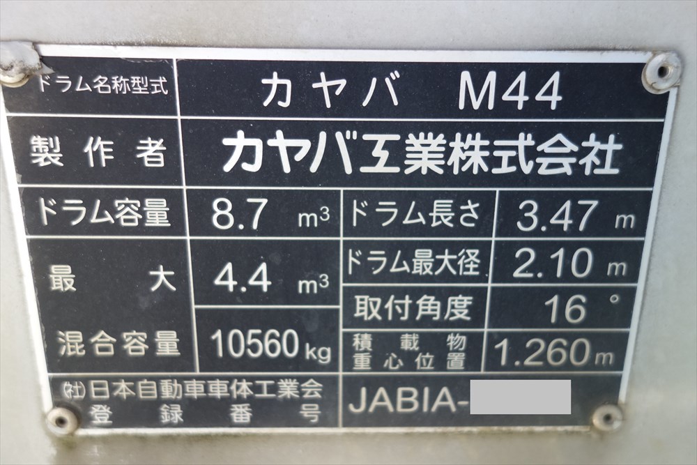 | コメント | カヤバ M44 最大容量:8.7立方メートル 最大混合容量:4.4㎥ 型式: MR4430 手動式ホッパーカバー付き 第3ブレーキ付 ETC 価格のお問い合わせは、090-2260-5723(ナカヤ)まで。 保障なし |