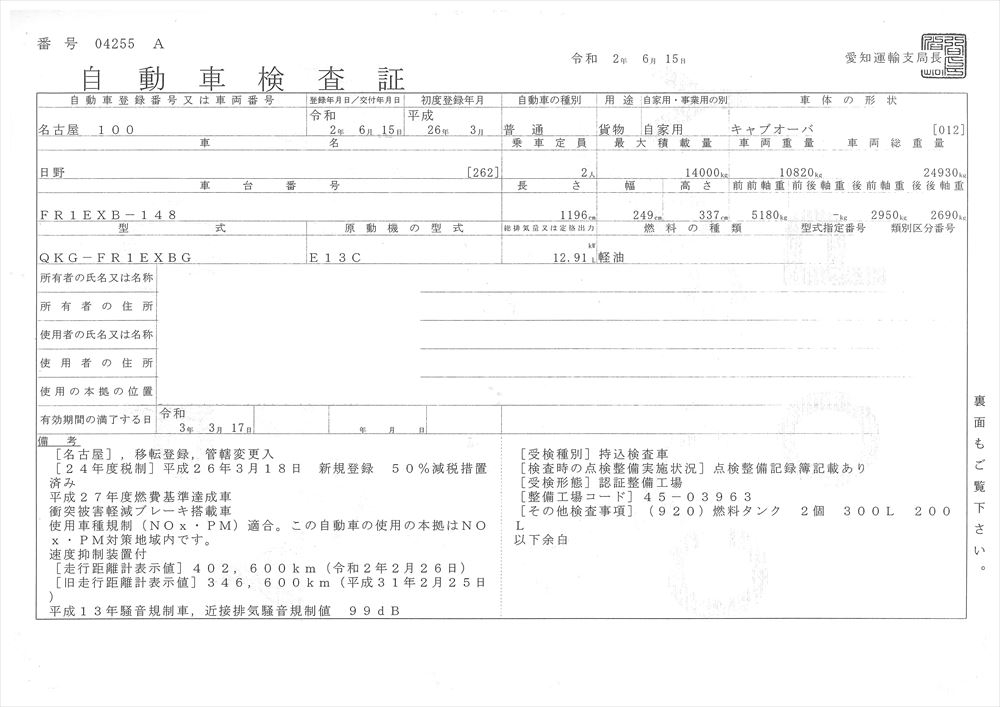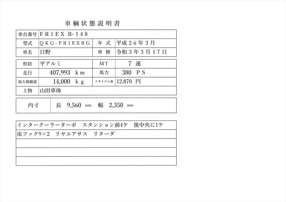 | コメント | 車検 令和3年3月17日 積載14.0t ミッション7速 走行40万7千Km ボディ長9m56 巾2m35 高60㎝ インタークーラーターボ スタンション前方4ケ 後中央1ケ 床フック9×2 リヤエアサス リターダ付いてます 価格のお問い合わせは、052-821-1557(ナカヤ)まで。 保証なし  |