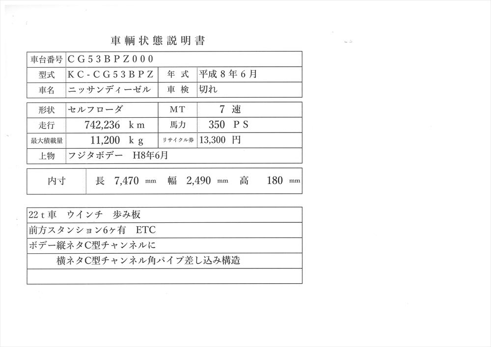 | コメント | フジタボデー H8年6月 22t車 ウインチ アユミ板 縦横ネダ鉄 前方スタンション6ヶ有 ETC 価格のお問い合わせ052-821-1557名輸自動車(ナカヤ)までお電話お待ちしてます。 |