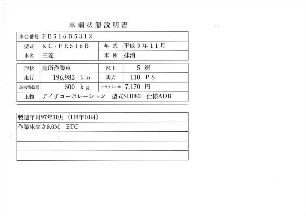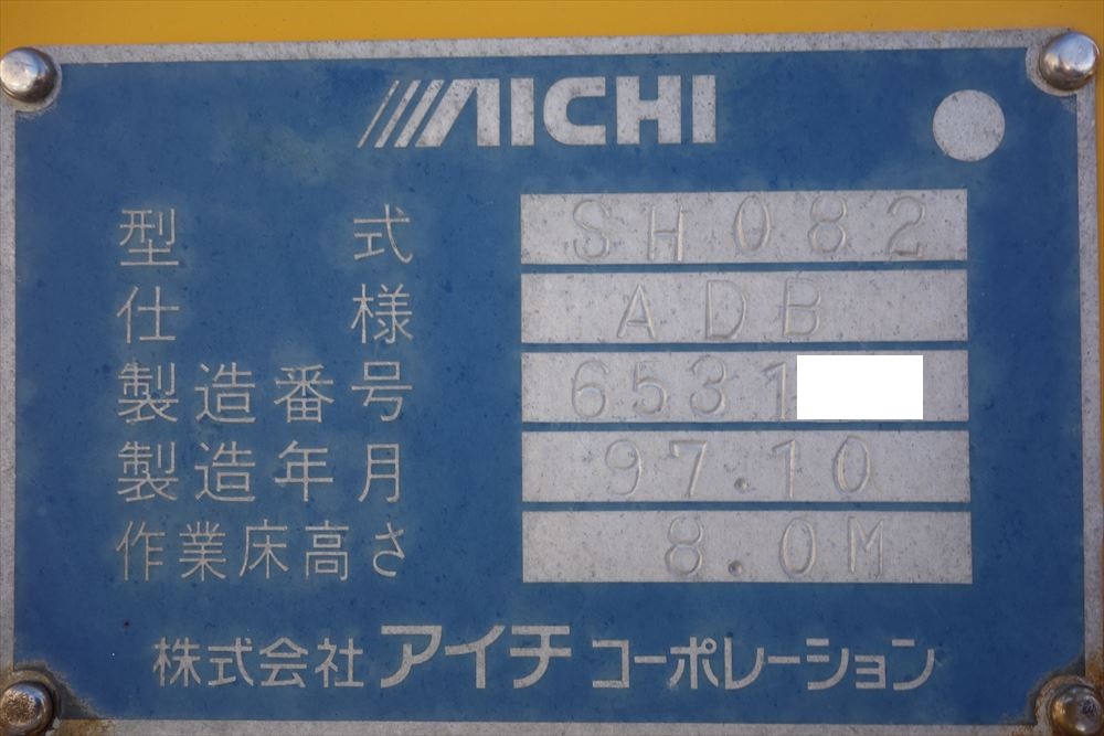 | コメント | アイチコーポレーション 型式SH082 製造年月97年10月(H9年10月) 作業床高さ8m ETC 価格のお問い合わせ052-821-1557ナカヤまでお電話お待ちしてます。 |