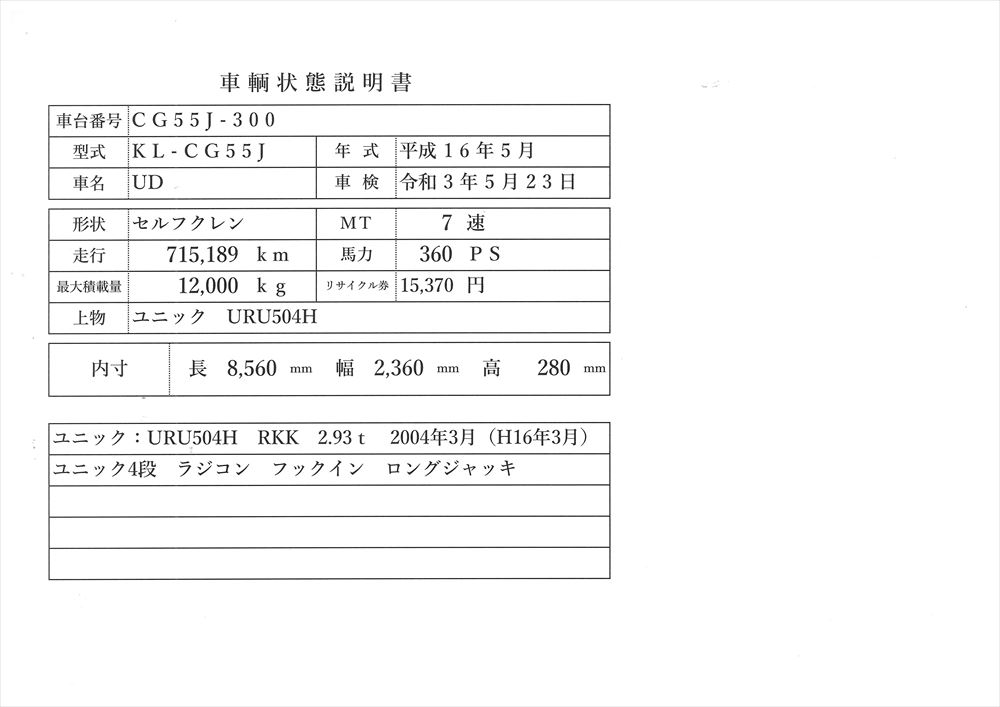 | コメント | セルフクレン 4段ラジコン フックイン 4軸低床 ユニック:URU504H RKK 2.93t ロングジャッキ 車検 令和3年5月 煽り脱着可能 ボディ長8m56 巾2m49 高30 360Ps 7速ミッション アドブルー排気マフラー焼き 不要です 排気ガスクリア 価格のお問い合わせ052-821-1557ナカヤまでお電話お待ちしてます |