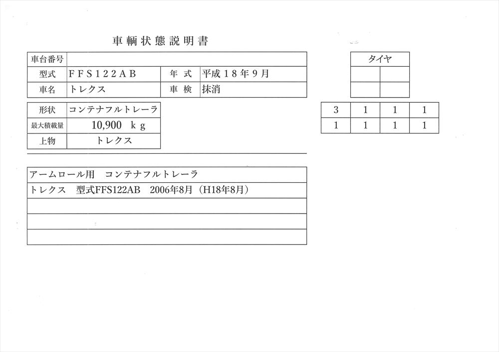 | コメント | コンテナ フルトレーラ アームロール トレクス 型式FFS122AB 2006年8月(H18年8月) 価格のお問い合わせ052-821-1557ナカヤまでお電話お待ちしてます。 |