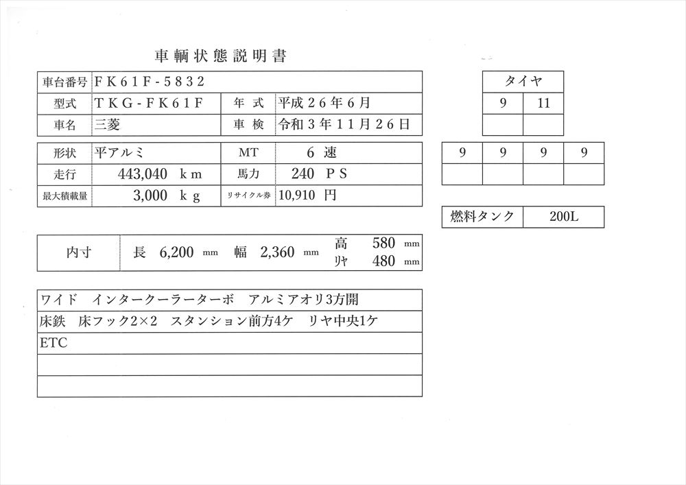 | コメント | 長6.2m 巾広236 高60 車検11月 240㎰ 6速 アルミ煽 価格のお問い合わせ052-821-1557名輸自動車(ナカヤ)までお電話お待ちしてます。 |