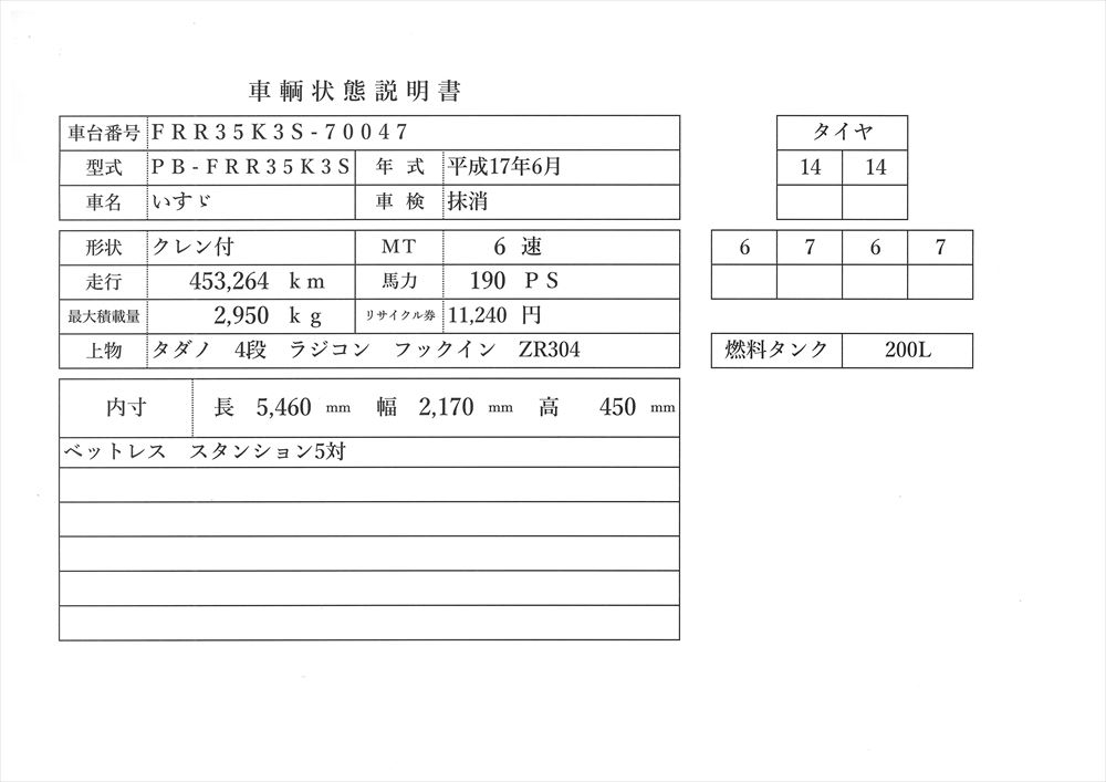 | コメント | タダノ2.9t吊り ZR304 2005年6月(平成17年6月) 4段 ラジコン フックイン 長5m46 巾2m17 高45cm イスズ4t 積載2.95t スタンション柱5対 床フック取付予定 6速ミッション 直列6気筒190Ps 価格のお問い合わせ052-821-1557名輸自動車(ナカヤ)までお電話お待ちしてます。 |
