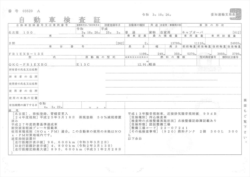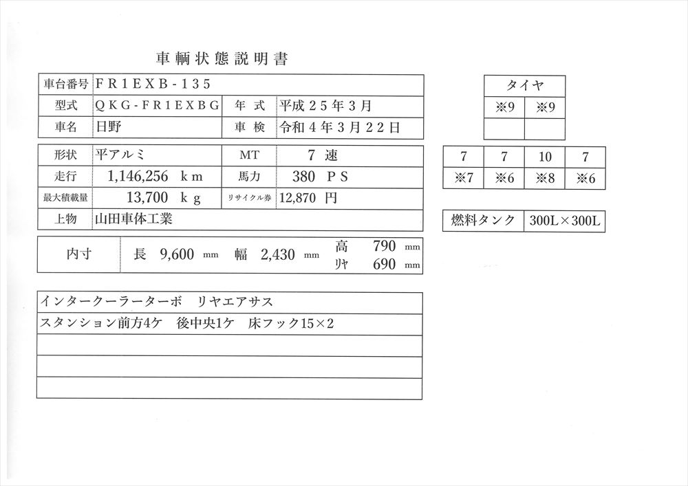 | コメント | 日野25年平アルミ 車検令和4年3月22日 ボデー長9.60m 巾2.43m 高79㎝ 積載13.7t 7速ミッション 380Ps リヤエアサス スタンション前方4ケ 後中央1ケ 床フック15×2 エンジン ミッション クラッチ デフ 正常作動確認済です 価格のお問い合わせ052-821-1557名輸自動車 中谷(ナカヤ)までお電話お待ちしてます。 |