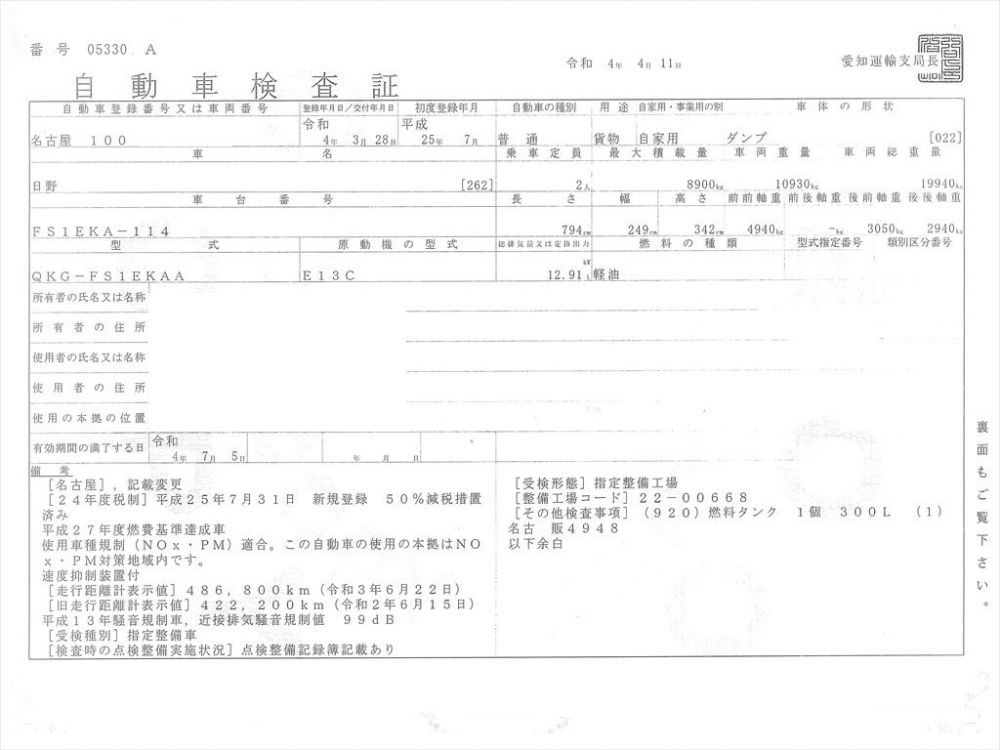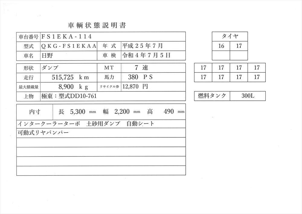 | コメント | 日野 土砂用ダンプ 平成25年式 車検令和4年7月15日 可動式リヤバンパー(アスファルトこうざい作業時格納) 2デフ 7速ミッション 380Ps 自動シート ボデー長5.3m巾2.2m高4.9m 積載8.9t 価格のお問い合わせ052-821-1557名輸自動車 中谷(ナカヤ)までお電話お待ちしてます。 |