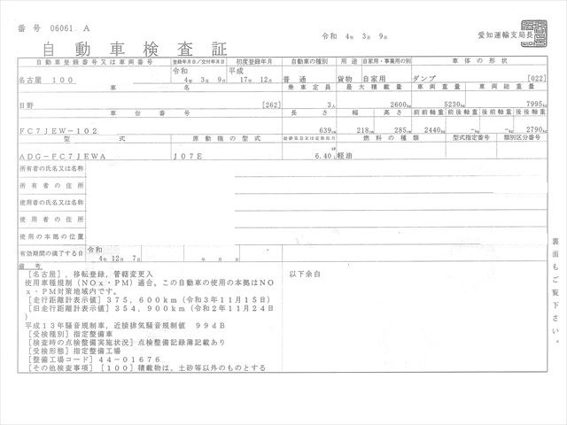 | コメント | 日野4t ロング深ダンプ10.4立 ボデー内寸 L4m30 W2m01 H1m20 積載2.6t 車検4年12月 新明和:DR4-01S リヤ片開き煽り 210Ps6速ミッション 平成17年式 価格のお問い合わせ052-821-1557名輸自動車(ナカヤ)までお電話お待ちしてます。 |