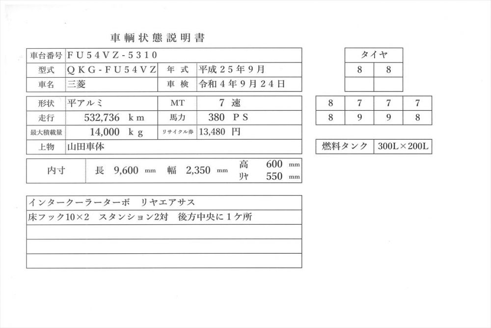 | コメント | 平成25年式 三菱ふそう 3軸 アルミ煽り高床平ボデー 積載14t 7速ミッション 車検令和4年9月24日 走行53万㎞ ボデー内寸 長9m60 巾235 高60㎝ 山田車体ボデー リヤエアサス 床フック10×2 スタンション2対 後方中央1ヶ所 価格のお問い合わせ052-821-1557名輸自動車(ナカヤ)までお電話お待ちしてます。 |