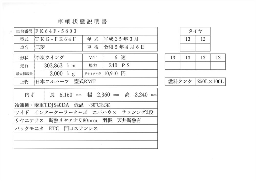 | コメント | 冷凍ウイング ワイド 平成25年式 三菱ふそう 長6m16 巾広2m36 高2m24 冷凍機:菱重 TDJS40DA -30℃設定 リヤエアサス ボデー 日本フルハーフ ラッシング2段 断熱80mm リヤ煽り 羽根天井断熱 価格のお問い合わせ052-821-1557名輸自動車 中谷(ナカヤ)までお電話お待ちしてます。 |