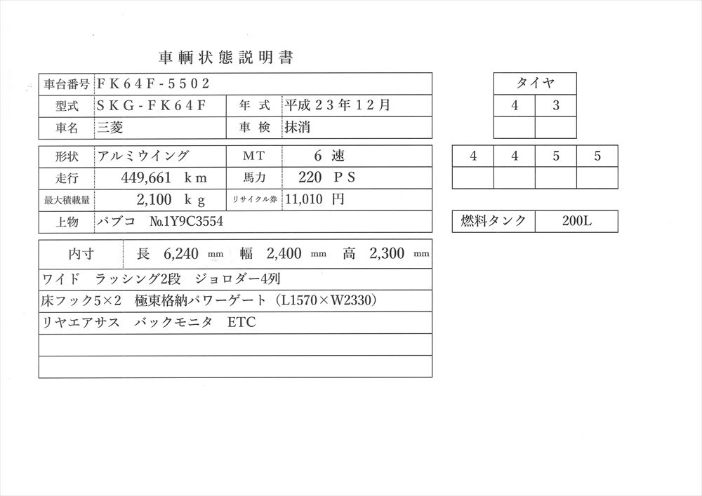 | コメント | アルミウイング 格納パワゲート 巾2m33 縦1m57 極東 エアサス ジョロダ 荷物 楽に前方移動 ラッシング2段 L6.2m W2.4m H2.3m(ボデー内寸) 積載2.1t ジョロダー4列 溝 角パイプ脱着式 平です 床フック5×2 バックモニタ 三菱ふそう 平成23年式 SKG-FK64F 6速ミッション 車検 抹消 220Ps 価格のお問い合わせ052-821-1557名輸自動車 中谷(ナカヤ)までお電話お待ちしてます。 |