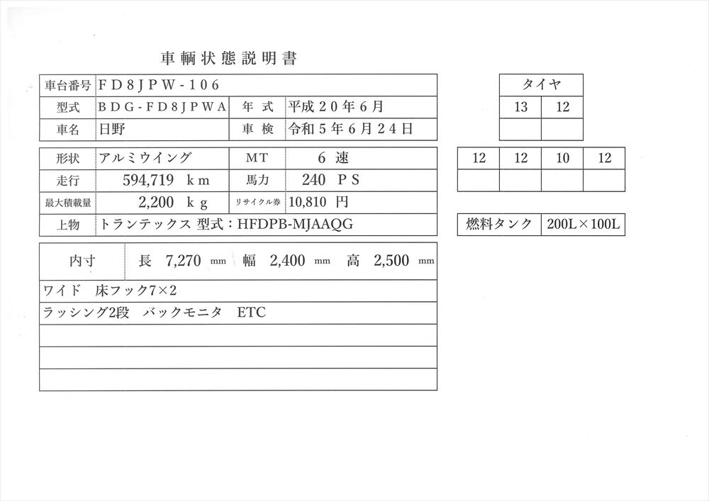 | コメント | アルミウイング ワイド ロング 長7.2m 巾広2.4m 高2.5m(高さ普通2.4ですが2.5あります) 車検令和5年6月24日24日 トランテックス 型式:HFDPB-MJAAQG 日野 20年式 BDG-FD8JLWA 240Ps 床フック7×2 ラッシング2段 バックモニタ 走行59万㎞ 6速ミッション 価格のお問い合わせ052-821-1557名輸自動車 中谷(ナカヤ)までお電話お待ちしてます。 |
