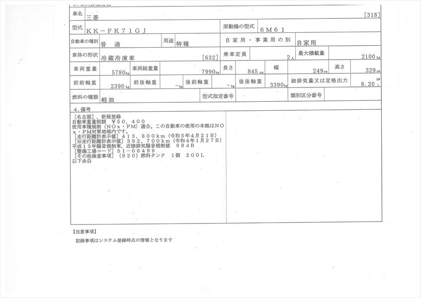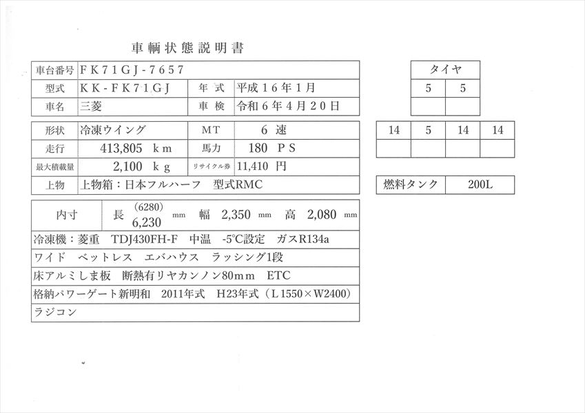 | コメント | 三菱ふそう 走行41万㎞ 車検付 令和6年4月 格納パワゲート新明和 ラジコン 冷凍ウイング ワイド ボデー内寸 長6.23m 巾広2.35m 高2.08m 冷凍機:菱重 TDJ430FH-F 上物箱:日本フルハーフ 型式RMC 床アルミしま板 エバハウス ラッシング1段 平成16年式 KK-FK71GJ アドブルー無し 焼きマフラー無し 積載2.1t 6速ミッション ラジコン +2°確認(写真)+18°から3時間半 価格のお問い合わせ052-821-1557名輸自動車 中谷(ナカヤ)までお電話お待ちしてます。 |