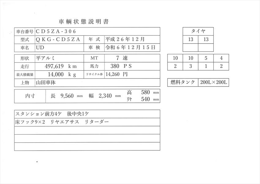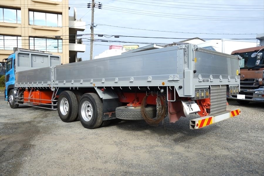| コメント | 平成26年式 平アルミ 積載14.0t 車検6年12月 走行49万7000㎞ 3軸 地上高130㎝ボデー床から地面 7速ミッション 380Ps UD QKG-CD5ZA ボデー 長9.56m 巾2.34m 高60㎝ スタンション前方4ケ 後中央1ケ 床フック9×2 リヤエアサス リターダー 良好です エンジン ミッション デフ ボデー山田車体 煽り 3方開閉 5方開閉 兼用できます 価格のお問い合わせ052-821-1557名輸自動車 中谷(ナカヤ)までお電話お待ちしてます。 |