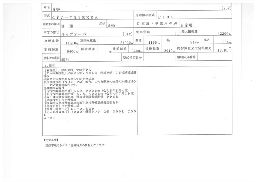 | コメント | 日野 平アルミ QPG-FR1EXEA 平成26年式 車検 6年8月5日 3軸 平ボデー アルミブロック 7速ミッション 380ps 走行68万㎞ ボデー内寸 長9.56m 巾2.4m 高70㎝ 床フック16×2 スタンション10×2 9×2 後方中央に1ケ リターダー 積載13t300 リーフサス 価格のお問い合わせ052-821-1557名輸自動車 中谷(ナカヤ)までお電話お待ちしてます。 |
