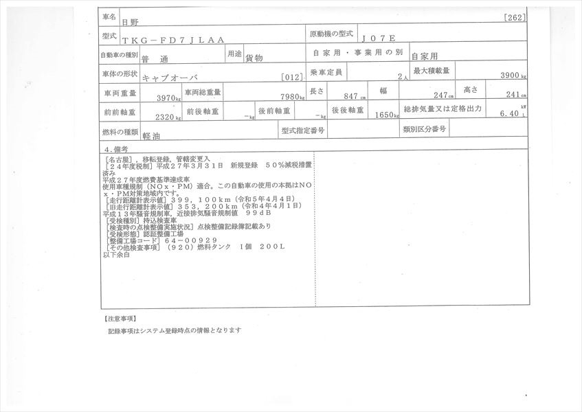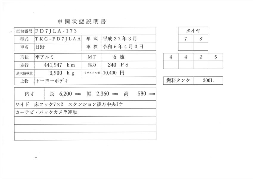 | コメント | 平成27年式 車検付 令和6年4月3日 日野 TKG-FD7JLAA 240ps 6速ミッション 積載 3.9t 平アルミ トーヨーボディ ワイド ボデー長6.2m 巾広2.36m 高58㎝ 床フック7×2 スタンション後方中央1ケ 価格のお問い合わせ052-821-1557名輸自動車 中谷(ナカヤ)までお電話お待ちしてます。 |