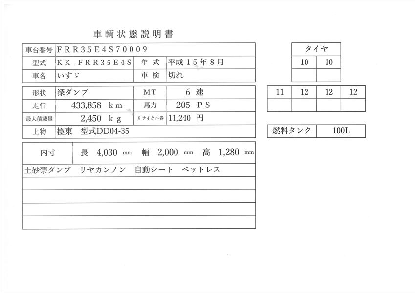 コメント | 深長ダンプ ボデー長4m 巾2m 高1m28 10.3㎥ リヤ観音扉 自動シート 極東ボデー 型式DD04-35 イスズ KK-FRR35E4S マフラー焼き無し 車検6年8月 積載2.45t 6速ミッション 205ps 平成15年式 価格のお問い合わせ052-821-1557名輸自動車 中谷(ナカヤ)までお電話お待ちしてます。 |
