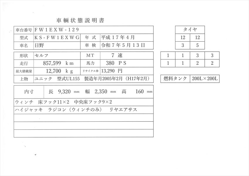 | コメント | セルフ 四軸低床 ウインチ ラジコン 積載12.7t 車検 令和7年5月13日 ユニック 型式UL155 ハイアウトリガー 名古屋ボデー 日野 平成17年式 KS-FW1EXW 7速ミッション 380ps 床フック11×2 中央床フック9×2 歩み板 格納庫付リヤ 2ヶ所ナンバープレート横 左右 ボデー長 L9m32 W2m35(煽り無W2m49)H16 価格のお問い合わせ052-821-1557名輸自動車 中谷(ナカヤ)までお電話お待ちしてます。 |