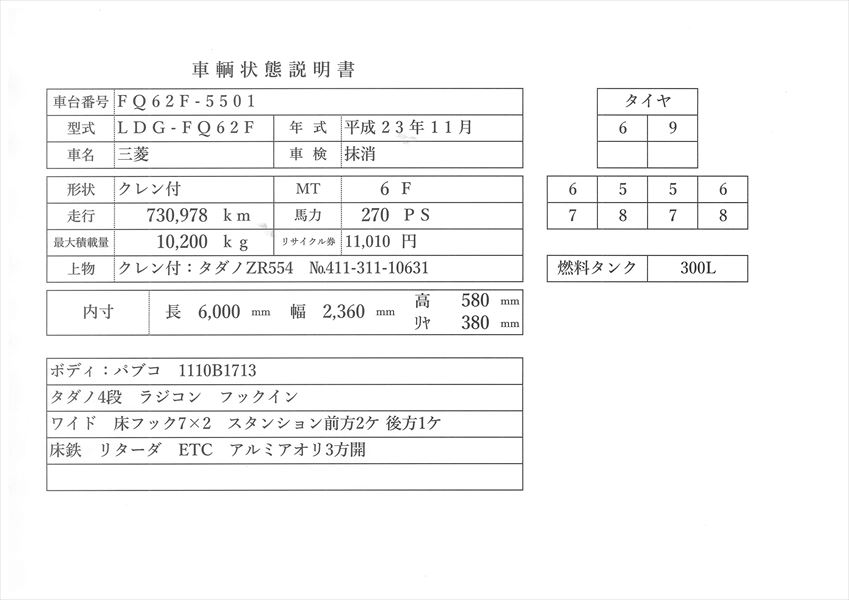 | コメント | 4段 ラジコン フックイン タダノ ZR554 2.93吊り 角足 差違 アウトリガー 三菱ふそう PDG-FQ62F 平成23年式 6速ミッション 270ps 2デフ 積載10,200㎏ 増t車 ボデー長6m ワイド2m36 高58㎝ 床フック7×2 スタンション前方2ケ 後方1ケ 床 鉄板 リターダ ETC アルミアオリ3方開 走行73万㎞ 価格のお問い合わせ052-821-1557名輸自動車 中谷(ナカヤ)までお電話お待ちしてます。 |
