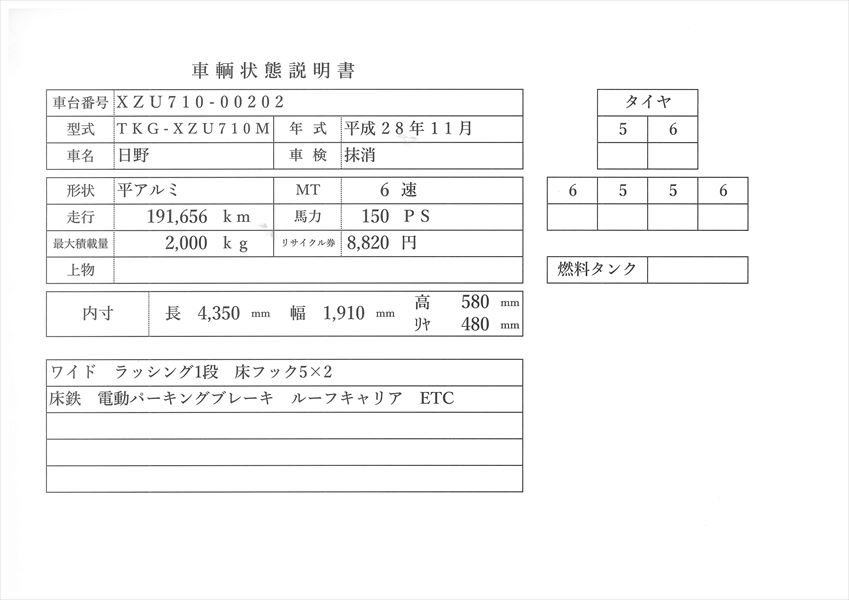 | 荷台内寸 | 435×191×58cm 長x幅x高 |