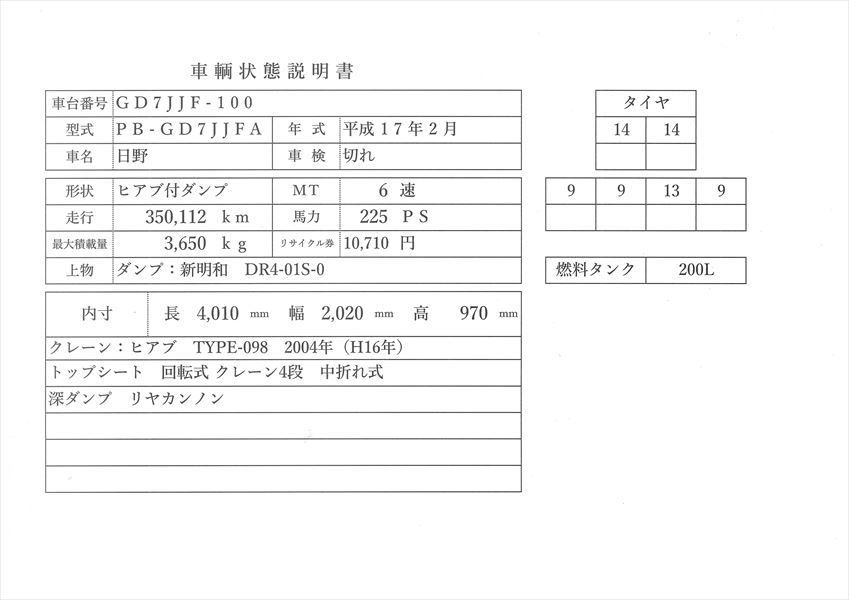 | コメント | 増t車 積載3.65t 車両総重量10,900t 中型免許で乗れます(積載6.5t 車両総重量11t)未満 クレーン ヒアブ 098D2 グラップル 掴み付 4枚刃 回転 クレーン4段 中折れ式 トップシート 深ダンプ ボデー長4m10 巾2m20 高97 8.7立 新明和 DR4-01S-0 リヤカンノン 6速ミッション 225ps 日野 平成17年式 車検6年12月26日 PB-GD7JJFA 走行35万㎞ 価格のお問い合わせ052-821-1557名輸自動車 中谷(ナカヤ)までお電話お待ちしてます。 |