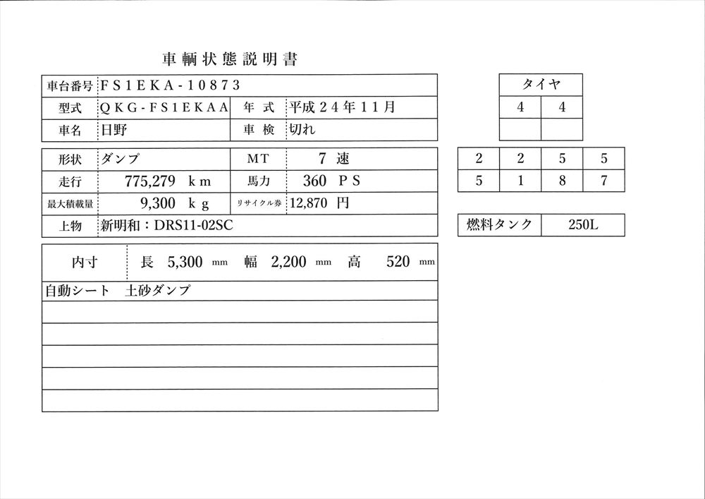 | コメント | 型式 QKG-FS1EKAA 車台番号 FS1EKA-10873 日野 平成24年式 車検 令和7年11月 積載9.3t ボデー内寸 L5300 W2200 H520 新明和:DRS11-02SC 土砂ダンプ 自動シート 価格のお問い合わせ052-821-1557名輸自動車 中谷(ナカヤ)までお電話お待ちしてます。 |