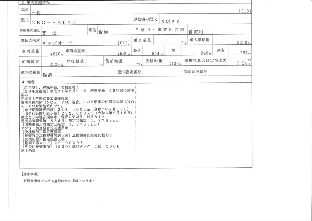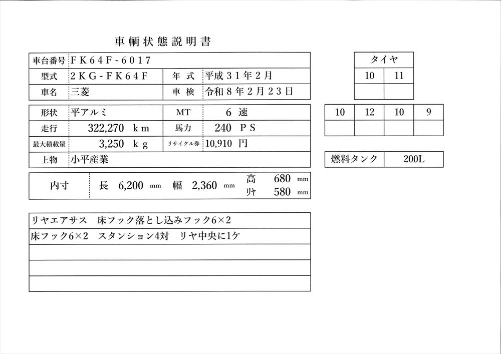 | コメント | 三菱ふそう 平成31年式 平アルミ 走行32万㎞ ボデー L6.2m ワイド2.36m H68㎝ 車検 令和8年2月 積載3250㎏ 6速ミッション 240ps 小平産業 リヤエアサス 床フック落とし込みフック6×2 床フック6×2 スタンション4対 リヤ中央に1ケ 価格のお問い合わせ052-821-1557名輸自動車 中谷(ナカヤ)までお電話お待ちしてます。 |