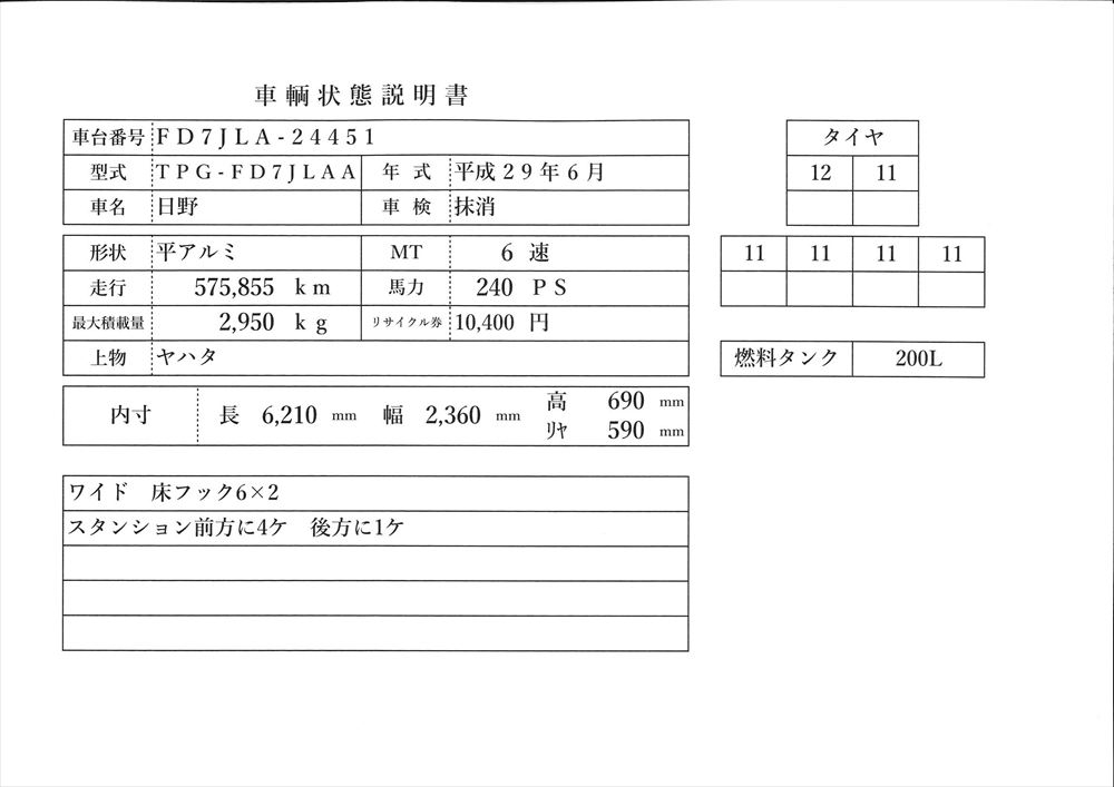 | コメント | 日野 平アルミ 平成29年式 型式 TPG-FD7JLAA 車台番号 FD7JLA-24451 ボデー内寸 L6.2m ワイド2.36m H70 6速ミッション 240ps 上物箱:ヤハタ 床フック6×2 鳥居 床フック1 スタンション前方に4ケ 後方に1ケ 床きれいです 積載3.1t 価格のお問い合わせ052-821-1557名輸自動車中谷(ナカヤ)までお電話お待ちしてます。 |