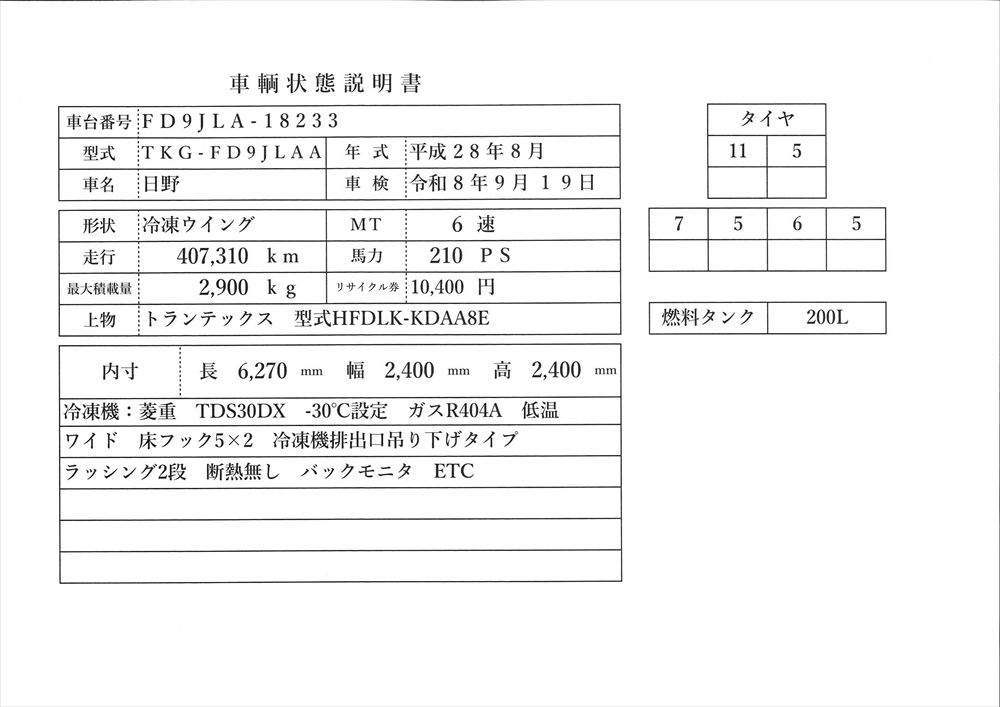 | コメント | 日野 冷凍ウイング 車検 令和8年9月 平成28年式 走行40万㎞ 積載2.9t ボデー内寸 L6.27m ワイド2.4m H2.4m 型式 TKG-FD9JLAA 車台番号 FD9JLA-18233 冷凍機:菱重 TDS30DX -30℃設定 低温ガス R404A 上物箱:トランテックス 型式HFDLK-KDAA8E 床フック5×2 ラッシング2段 210ps 6速ミッション 価格のお問い合わせ052-821-1557名輸自動車中谷(ナカヤ)までお電話お待ちしてます。 |