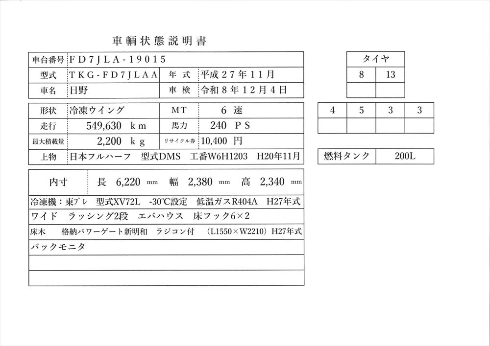 | コメント | 平成27年式 日野 冷凍ウイング 格納パワーゲート新明和 ラジコン付 -30℃設定 冷凍機:東プレ 型式XV72L ボデー内寸 長6.22m 巾広2.38m 高2.34m 上物箱:日本フルハーフ ラッシング2段 床フック6×2 6速ミッション 240ps 価格のお問い合わせ052-821-1557名輸自動車中谷(ナカヤ)までお電話お待ちしてます。 |