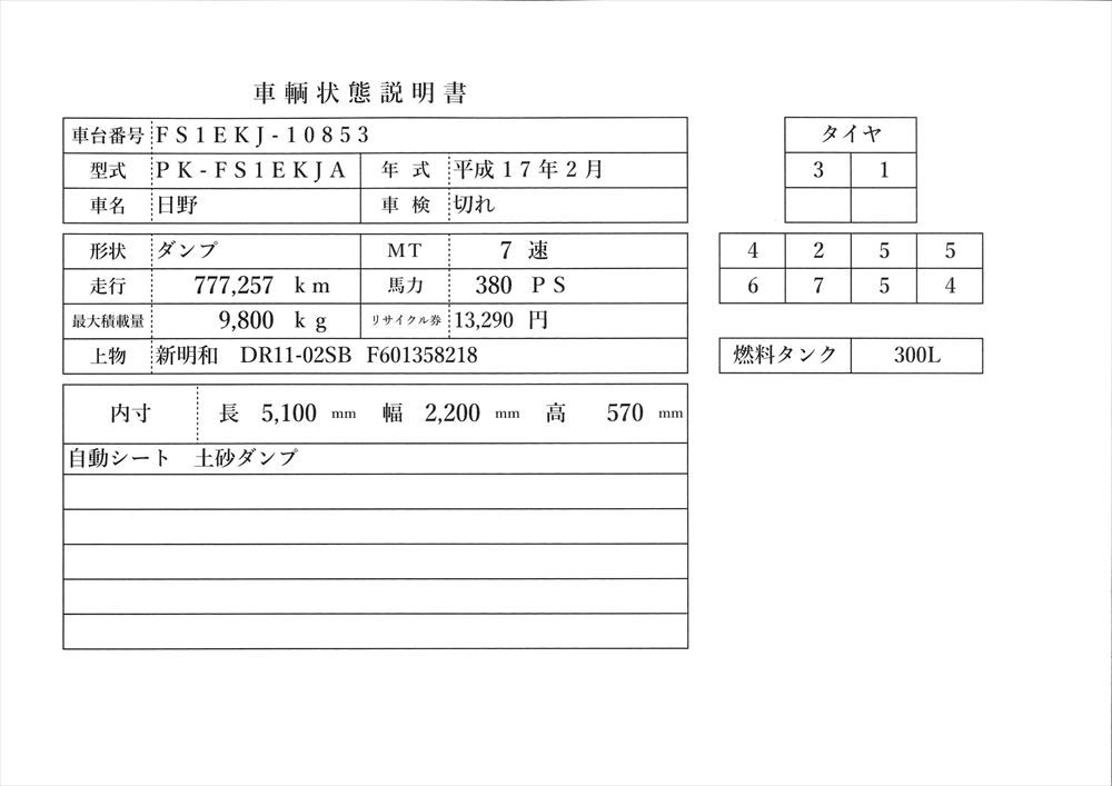 | コメント | 日野 2デフ 土砂用ダンプ 車台番号 FS1EKJ-10853 型式 PK-FS1EKJA 380ps 7速ミッション 積載9t800㎏ 走行77万㎞ 新明和 DR11-02SB ボデー内寸 L5100 W2200 H570 車検8年1月 自動シート 床 ヘルテン 1枚鋼 価格のお問い合わせ052-821-1557名輸自動車中谷(ナカヤ)までお電話お待ちしてます。 |