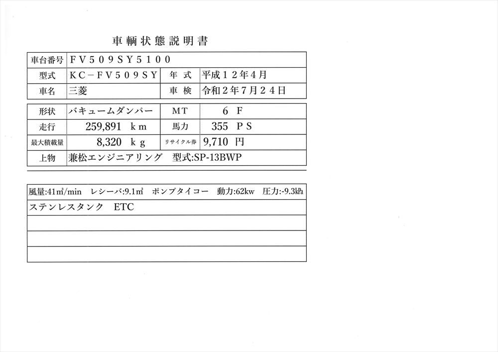 | コメント | 兼松エンジニアリング 型式:SP-13BWP 風量:41㎥/min レシーバ:9.1㎥ ポンプタイコー 動力:62kw 圧力:-9.3㎪ ステンレスタンク ETC 価格のお問い合わせは、052-821-1557(ナカヤ)まで。 保障なし |