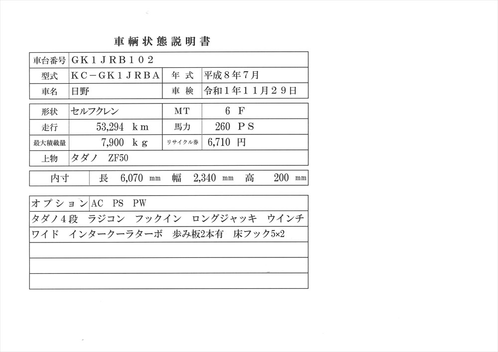 | コメント | 積載7.9t積 2デフ 走行53,000km タダノ4段 ラジコン フックイン ロングジャッキ ウインチ ワイド インタークーラターボ 歩み板2本有 床フック5×2 価格のお問い合わせは、052-821-1557(ナカヤ)まで。 保障なし |