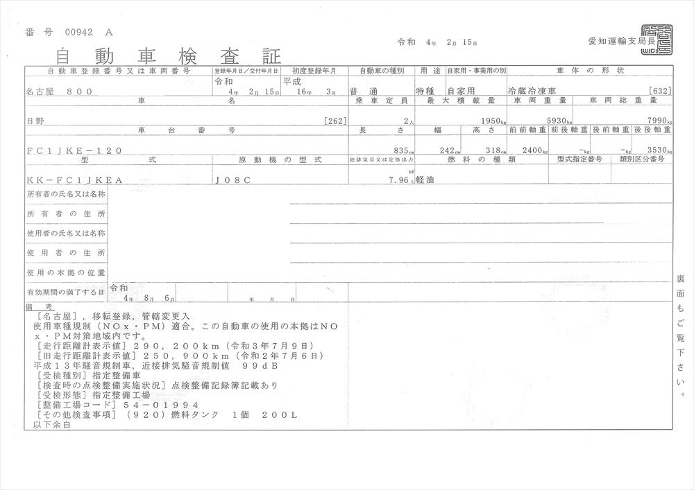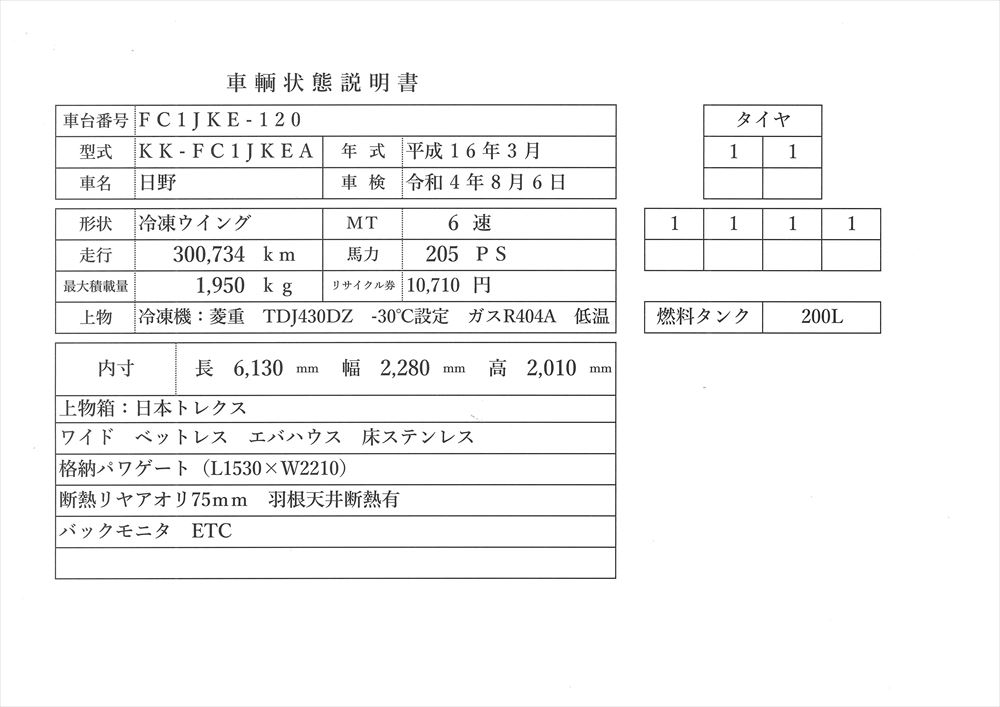 | コメント | 冷凍ウイング 格納パワゲート 極東 ボデー内寸 長6m13 断熱観音扉 鳥居 巾広2m28 断熱ウイング 高2m03 床ステンレス 冷凍機:菱重 TDJ430DZ -30℃設定 ワイド キャビンボデー ベットレス エバハウス バックモニタ 日野4t 車検8月6日 6速ミッション 205Ps 走行30万㎞ 平成16年式 型式 KK-FC1JKEA 排気マフラー焼無アドブルー装置無 故障心配無 積載1.95t 価格のお問い合わせ052-821-1557名輸自動車 中谷(ナカヤ)までお電話お待ちしてます。 |