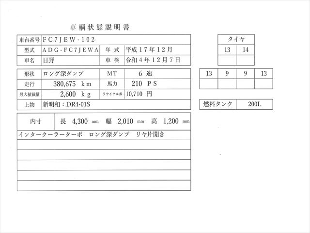 | コメント | 日野4t ロング深ダンプ10.4立 ボデー内寸 L4m30 W2m01 H1m20 積載2.6t 車検4年12月 新明和:DR4-01S リヤ片開き煽り 210Ps6速ミッション 平成17年式 価格のお問い合わせ052-821-1557名輸自動車(ナカヤ)までお電話お待ちしてます。 |