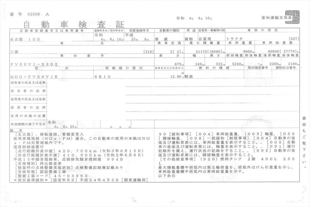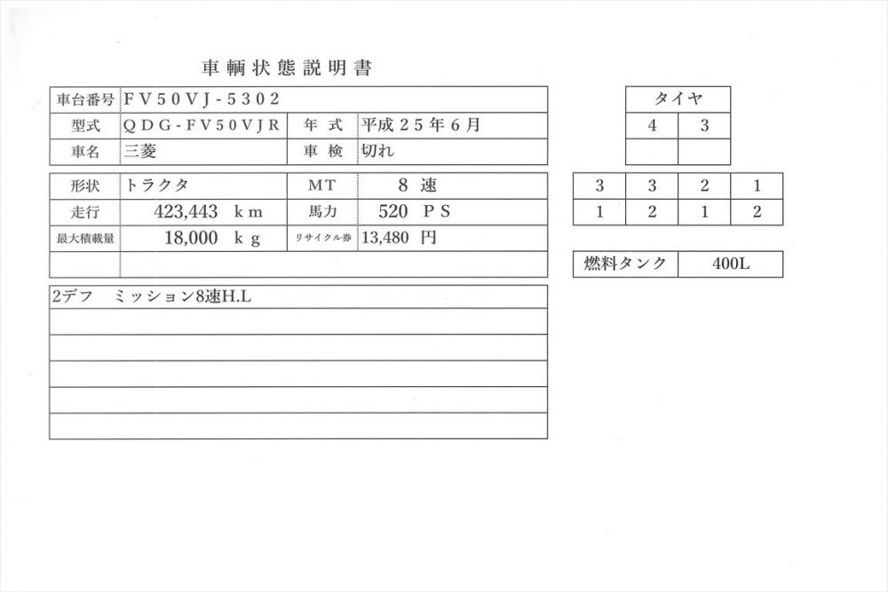| コメント | 三菱ふそう 平成25年式 走行42万㎞ 2デフ 正常確認 第五輪18t 切れ車検令和4年6月25日ナンバー付 ミッション8速HL 正常確認 520Psエンジン 正常確認 価格のお問い合わせ052-821-1557名輸自動車(ナカヤ)までお電話お待ちしてます。 |