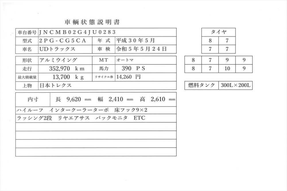 | コメント | UDトラックス 新型 平成30年式 4軸低床 アルミウイング 車検令和5年5月24日 積載13t700㎏ 日本トレクス ハイルーフ 床フック9×2 ラッシング2段 リヤエアサス バックモニタ ETC 390Ps 走行35万㎞ 300L+200L 燃料タンク ミッションAT キャビン白 価格のお問い合わせ052-821-1557名輸自動車 中谷(ナカヤ)までお電話お待ちしてます。 |