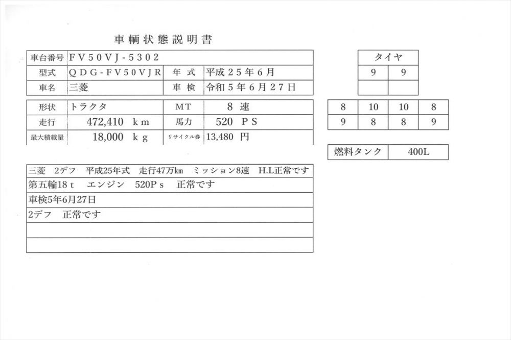 | コメント | 三菱 平成25年式 2デフ 正常です 走行47万㎞ 520Ps エンジン正常です 8速ミッション H.L正常です 第五輪18t 車検5年6月27日 価格のお問い合わせ052-821-1557名輸自動車(ナカヤ)までお電話お待ちしてます。 |