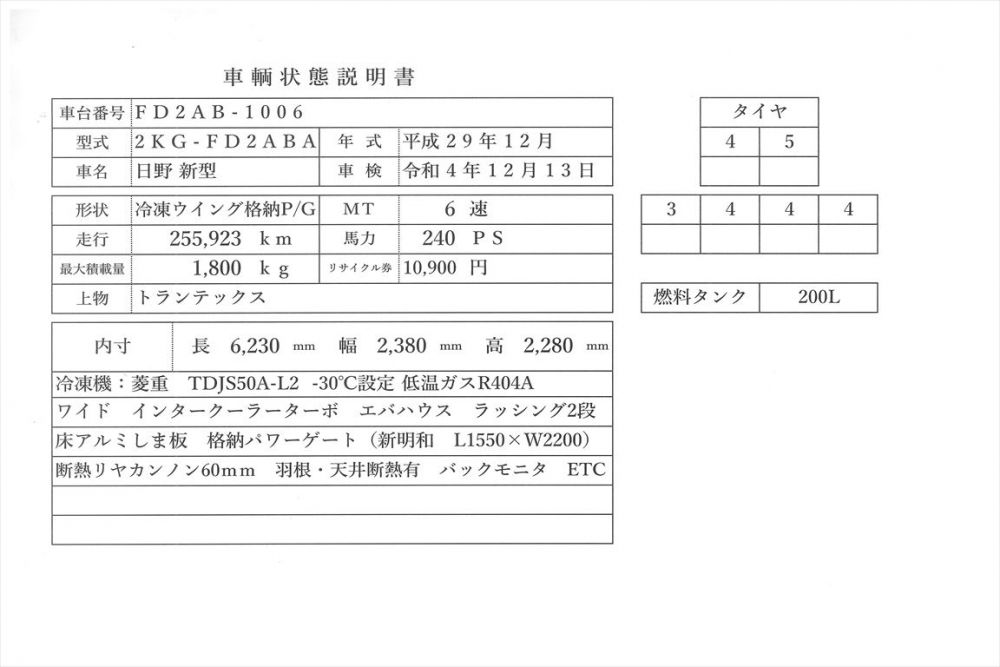 | コメント | 新型 日野 平成29年式 車検4年12月 240Ps ワイド 冷凍ウイング 格納P/G 冷凍機:菱重 TDJS50A-L2 -30℃設定低温ガスR404A 長6.23m 巾ワイド2.38 高2.28 上物箱:トランテックス 床アルミしま板 格納パワーゲート (新明和 L1550×W2200) メッキ コーナーパネル フロントパネル バンパー バックミラー 価格のお問い合わせ052-821-1557名輸自動車(ナカヤ)までお電話お待ちしてます。 |