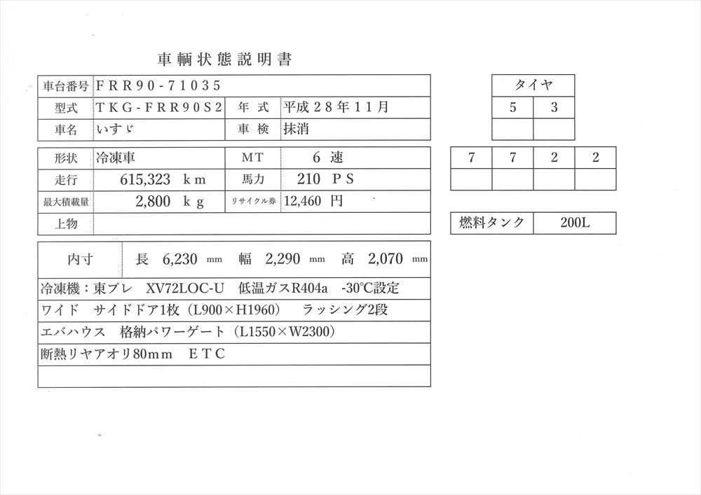 | コメント | いすゞ 平成28年式 TKG-FRR90S2 210Ps 6速ミッション 冷凍機 東プレXVLOC-U 低温ガスR404a -30℃設定 格納パワゲート新明和 (縦1550×巾2300) ワイドボデー 長6.2m 巾広2.29m 高2.07m 左サイドドア(巾900×高1960) ラッシング2段 エバハウス バックモニタ 走行61万㎞ 断熱リヤアオリ80mm 価格のお問い合わせ052-821-1557名輸自動車 中谷(ナカヤ)までお電話お待ちしてます。 |