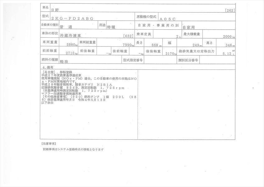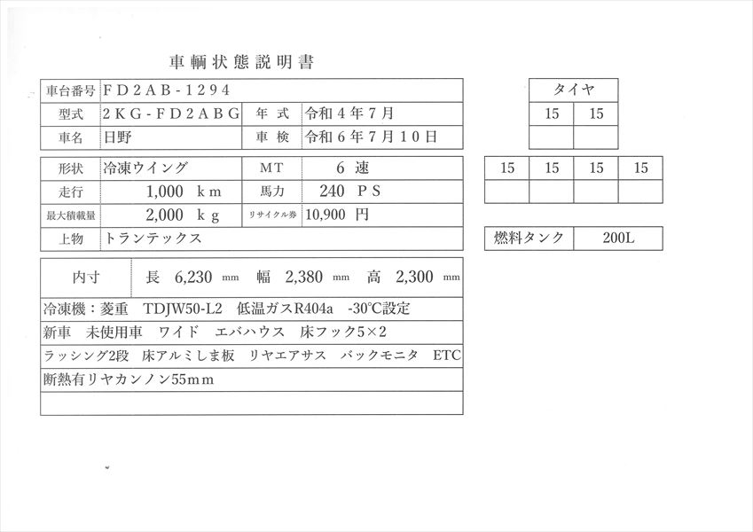 | コメント | 未使用車 日野 令和4年式 車検 令和6年7月10日 240Ps 冷凍ウイング 内寸 長6m23 ワイド 2m38 高2m30 積載2.0t 冷凍機:菱重 TDJW50-L2 低温ガスR404a -30℃設定 上物箱:トランテックス 全面断熱 床フック5×2 ラッシング2段 床アルミしま板 ステンレス張り 傷避けの為 煽り内側 下半分 ボデー前下部 リヤエアサス 6速ミッション 240Ps 断熱リヤカンノン55mm バックモニタ リヤ煽り内側 開き過ぎ止めロックバー付 全開もできますロックバー(はずしたら) 価格のお問い合わせ052-821-1557名輸自動車 中谷(ナカヤ)までお電話お待ちしてます。  |