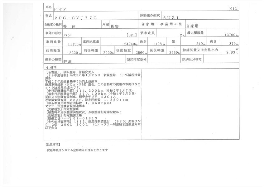 | コメント | いすゞ 2PG-CYJ77C アルミウイング 平成30年式 走行41万㎞ 積載13t700㎏ 4軸低床 リヤエアサス 380Ps インタークーラーターボ 7速ミッション 車検 令和6年3月6日 燃料タンク300L+300L リターダー バックモニタ 日本フルハーフ型式DKL ボデー長9m68 巾2m40 高2m65 ラッシング2段 床フック9×2 価格のお問い合わせ052-821-1557名輸自動車 中谷(ナカヤ)までお電話お待ちしてます。 |