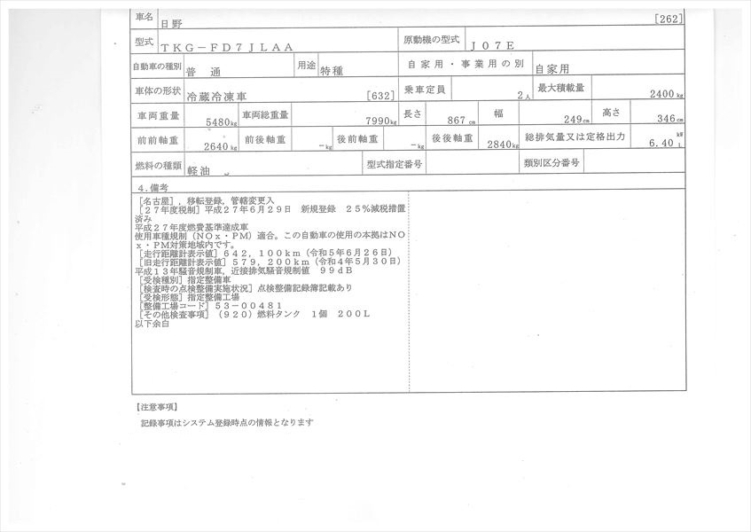 | コメント | 冷凍機:菱重 TDJS50DB ボデー 長6.2mワイド2.37m高2.28m 240Ps 6速ミッション エバハウス ラッシング2段 床アルミしま板 バックモニタ TKG-FD7JLAA 積載2.4t 走行64万㎞ 53万4千㎞走行時 新品E/G乗替 乗せ替え後11万㎞走行 価格のお問い合わせ052-821-1557名輸自動車 中谷(ナカヤ)までお電話お待ちしてます。  |