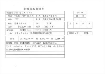 | コメント | 冷凍機:菱重 TDJS50DB ボデー 長6.2mワイド2.37m高2.28m 240Ps 6速ミッション エバハウス ラッシング2段 床アルミしま板 バックモニタ TKG-FD7JLAA 積載2.4t 走行64万㎞ 53万4千㎞走行時 新品E/G乗替 乗せ替え後11万㎞走行 価格のお問い合わせ052-821-1557名輸自動車 中谷(ナカヤ)までお電話お待ちしてます。 |