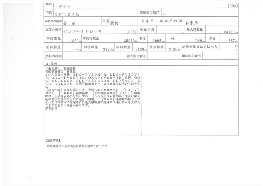 | コメント | 未使用車 令和6年式 車検 令和7年3月 3軸トレーラ 土砂禁ダンプ 積載24100㎏ 第五輪荷重9340㎏以上 車輛総重量35980㎏ 41.4㎥ 内寸10m 巾2.3m 高1.8m リヤ煽り片開き シングル引き ダブル引き コダイラ KFL32 車両総重量35,980㎏ リヤ扉 開閉電動ロック スエーデン鋼ボデー 価格のお問い合わせ052-821-1557名輸自動車 中谷(ナカヤ)までお電話お待ちしてます。 |