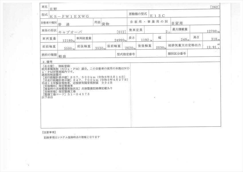 | コメント | セルフ 四軸低床 ウインチ ラジコン 積載12.7t 車検 令和7年5月13日 ユニック 型式UL155 ハイアウトリガー 名古屋ボデー 日野 平成17年式 KS-FW1EXW 7速ミッション 380ps 床フック11×2 中央床フック9×2 歩み板 格納庫付リヤ 2ヶ所ナンバープレート横 左右 ボデー長 L9m32 W2m35(煽り無W2m49)H16 価格のお問い合わせ052-821-1557名輸自動車 中谷(ナカヤ)までお電話お待ちしてます。 |