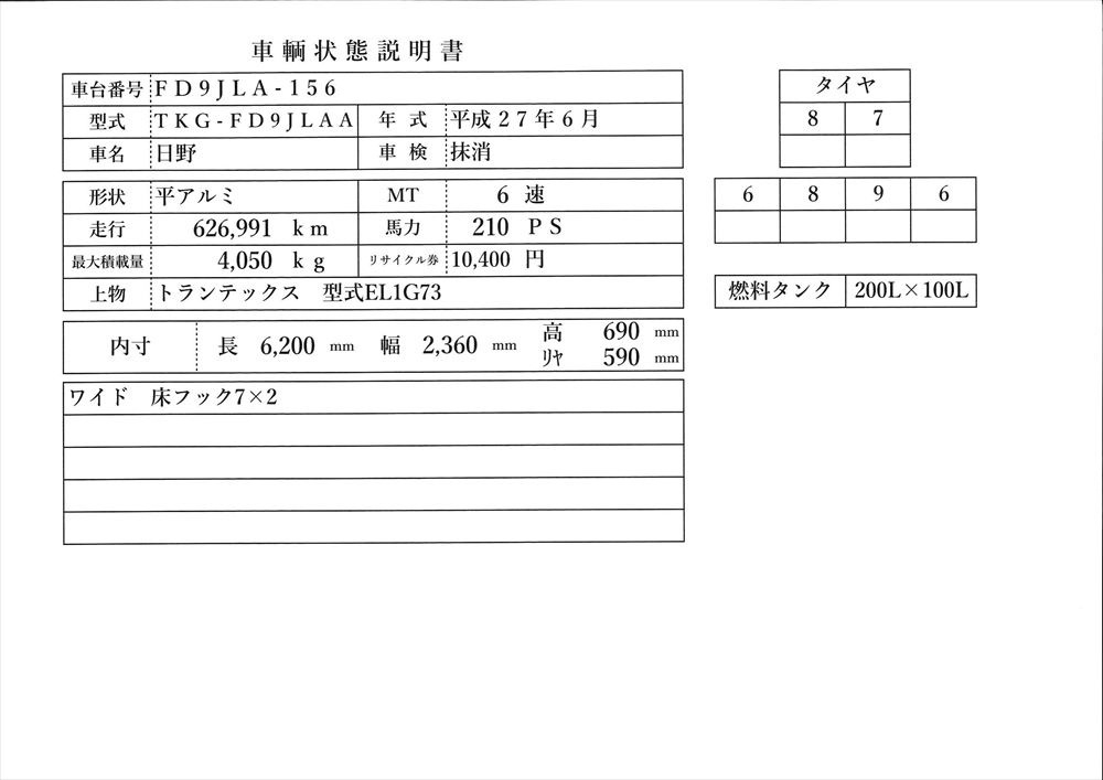 | コメント | 日野 平成27年式 平アルミ 4.05t積載 ボデー内寸 長6.2m ワイド2.36m 高70㎝ トランテックス 型式EL1G73 床フック7×2 210ps 6速ミッション 価格のお問い合わせ052-821-1557名輸自動車中谷(ナカヤ)までお電話お待ちしてます。 |